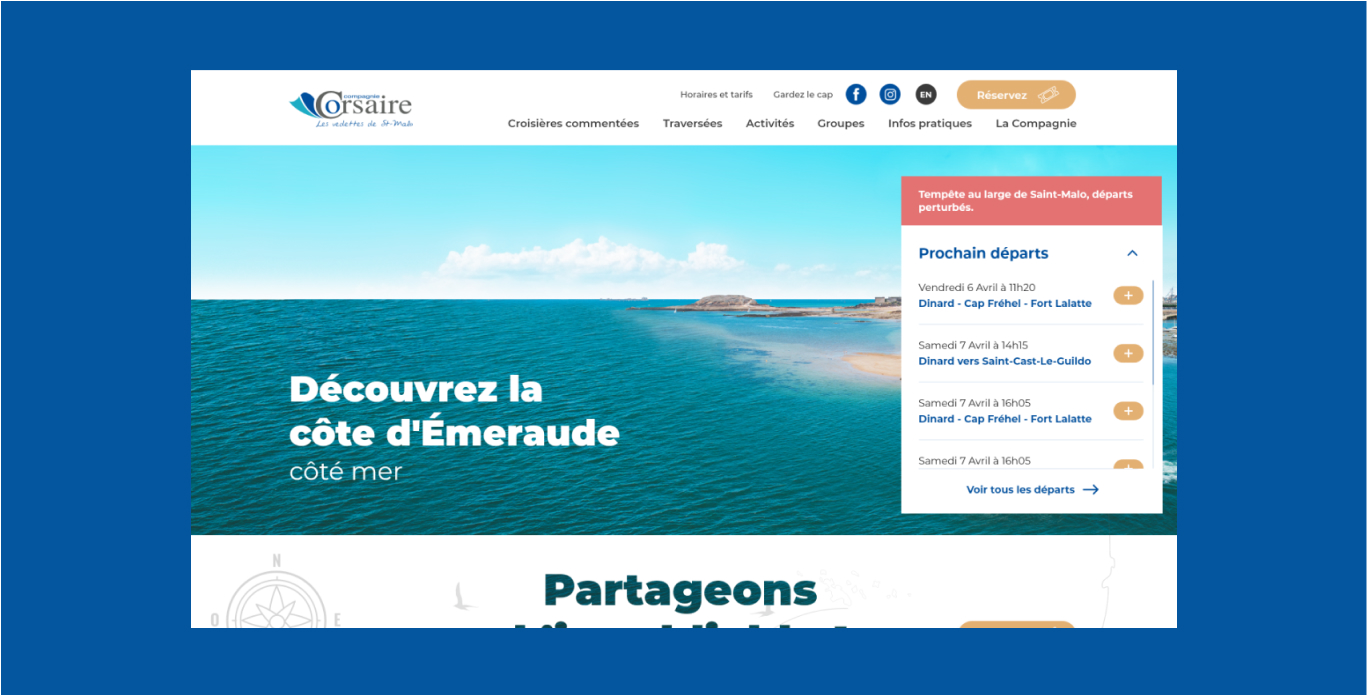 Un site pour capter des clients en recherche d’activité sur la côte d’émeraude en Bretagne (tourisme local, français et international) et pour autonomiser les voyageurs tout en déchargeant le service client téléphonique (réponse à des questions pratiques : temps à prévoir avant l’embarquement, parking, équipement à bord, etc.).